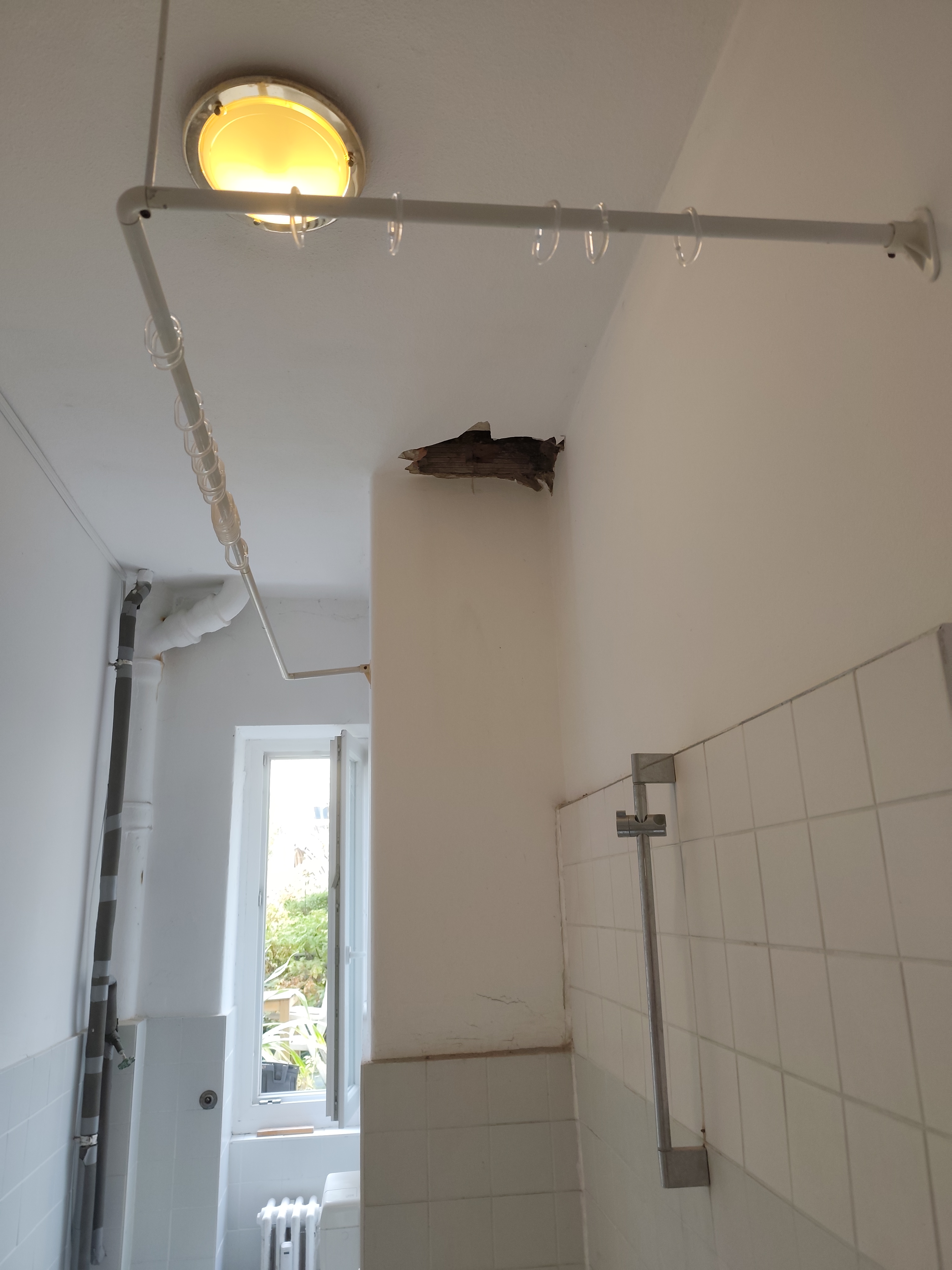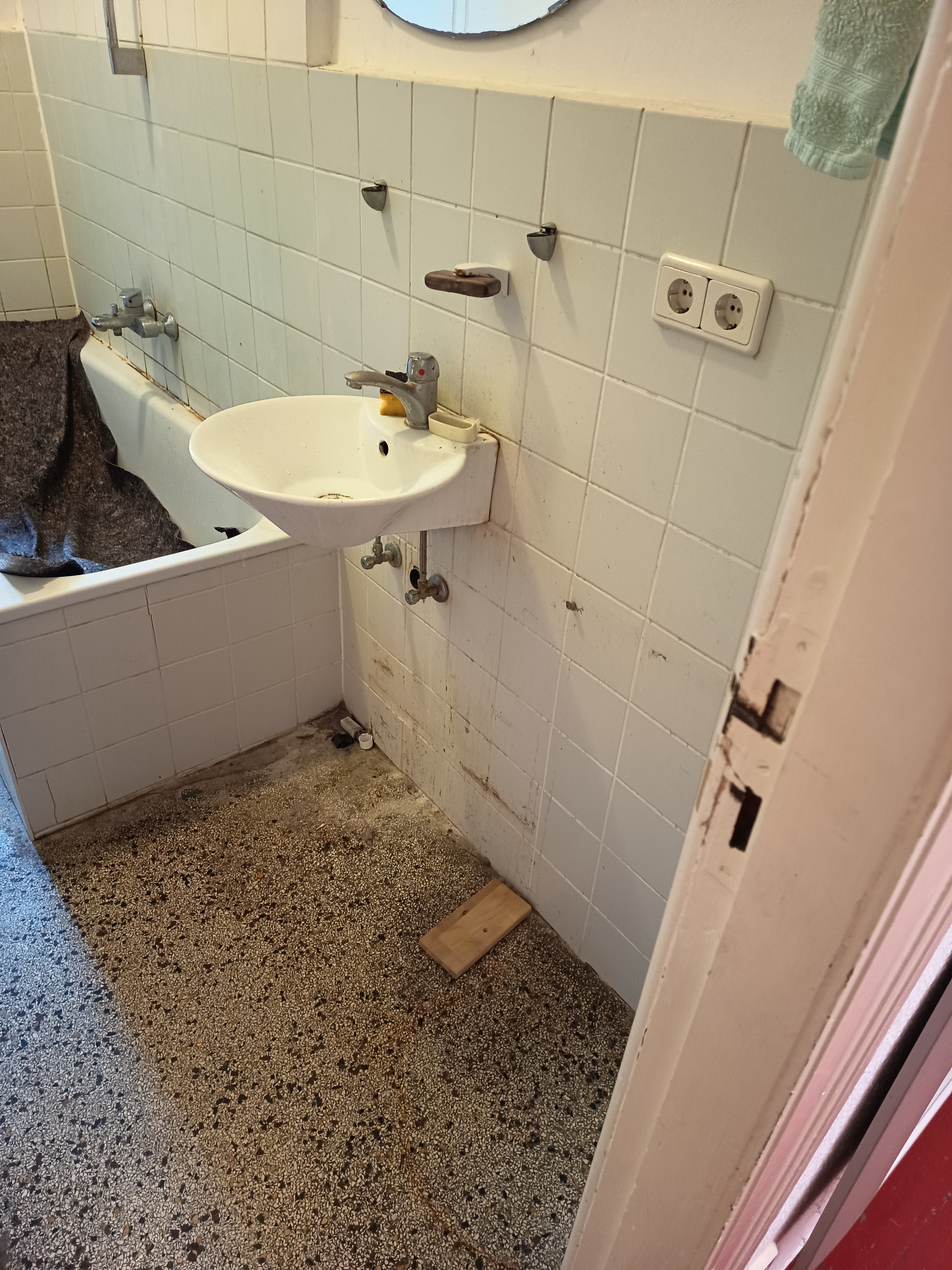 | 2 | 27.10.2025 | Ansicht des Badezimmers am Beginn der Bauarbeiten. Abflussrohr am Waschbecken bereits demontiert. Durchbruch in der Decke. |
