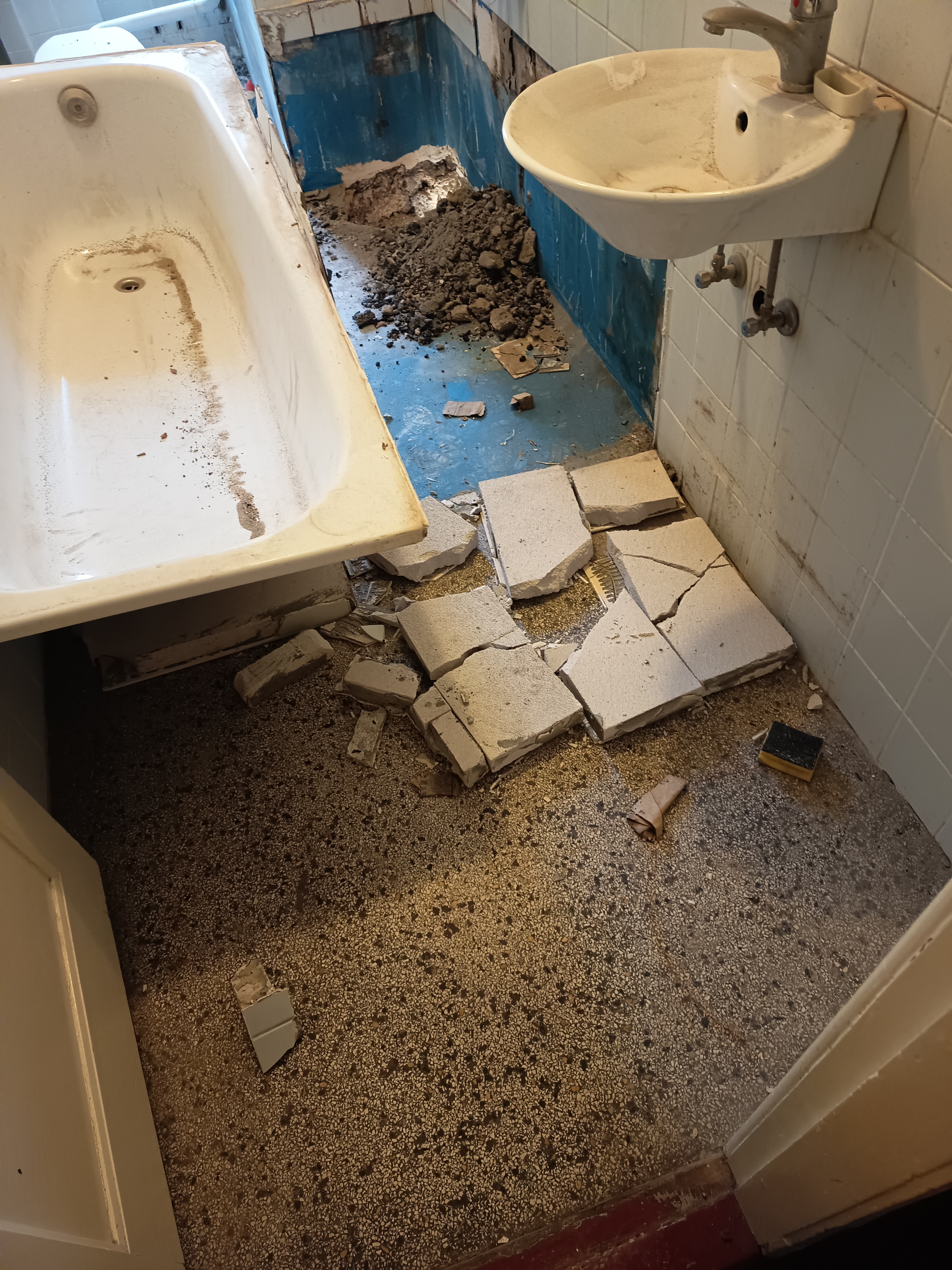 | 3 | 28.10.2025 | Fortsetzung der Abbrucharbeiten: Badewanne entfernt, Boden aufgerissen. |