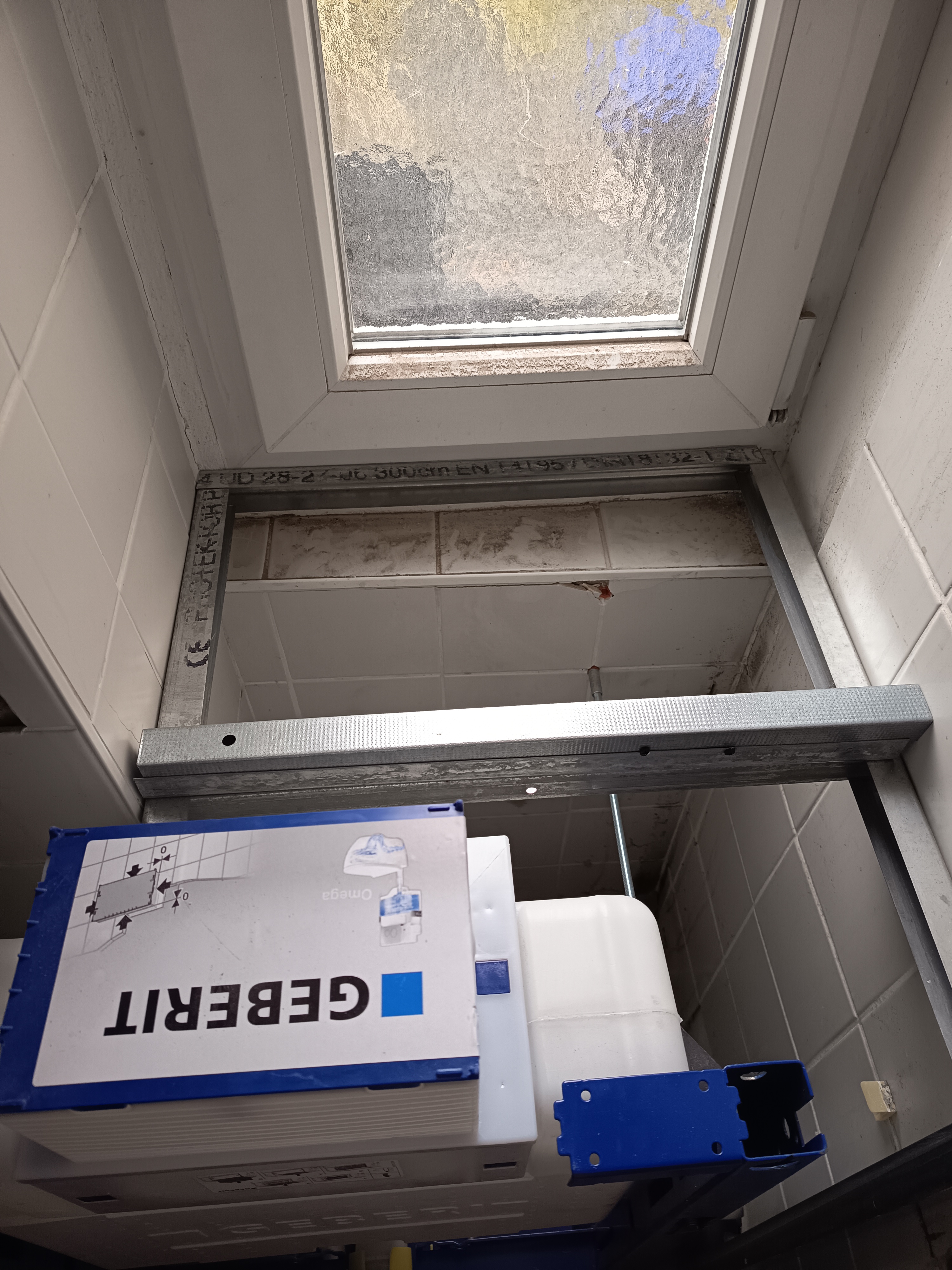 Funktionseinschränkung Fenster: Das Badfenster lässt sich nach der Strangsanierung aufgrund der neu montierten Trockenbau-Unterkonstruktion (Metallständerwerk) nicht mehr vollständig öffnen [5, 13, 14]. | Verstoß gegen § 47 BauO Bln (Fenster, Lüftung). |