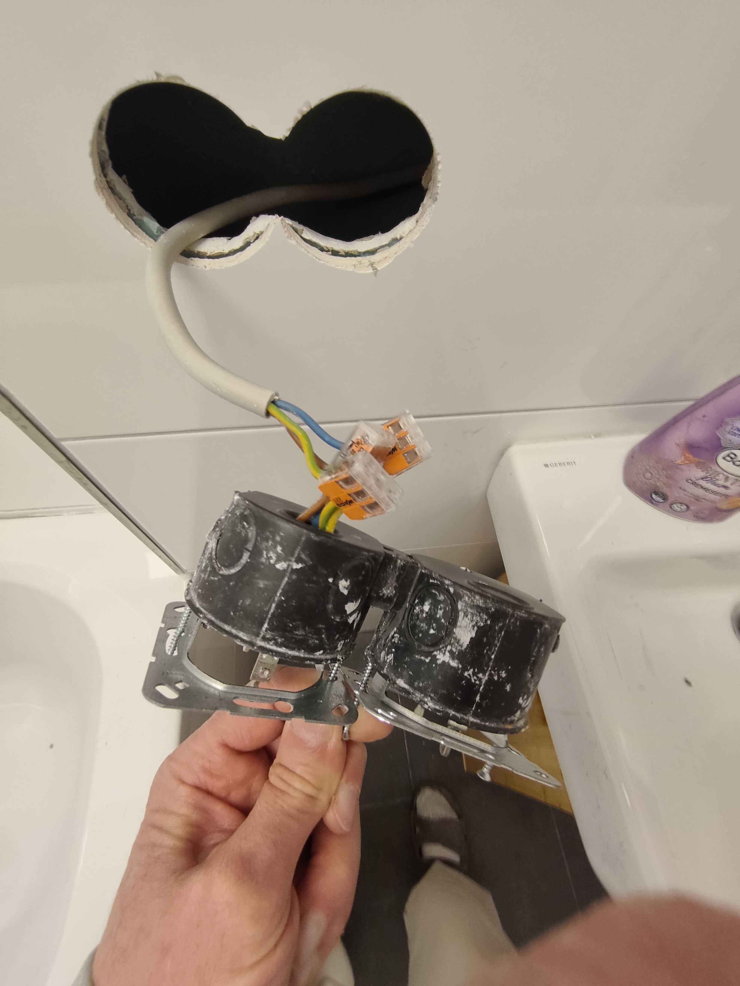 Tätigkeit: Herstellung und Montage einer Steckdose im Hohlraum-Regipsbereich, inkl. Spachtelarbeiten, mehrfache Demontage/Montage und Anpassung wegen der Unterkonstruktion.