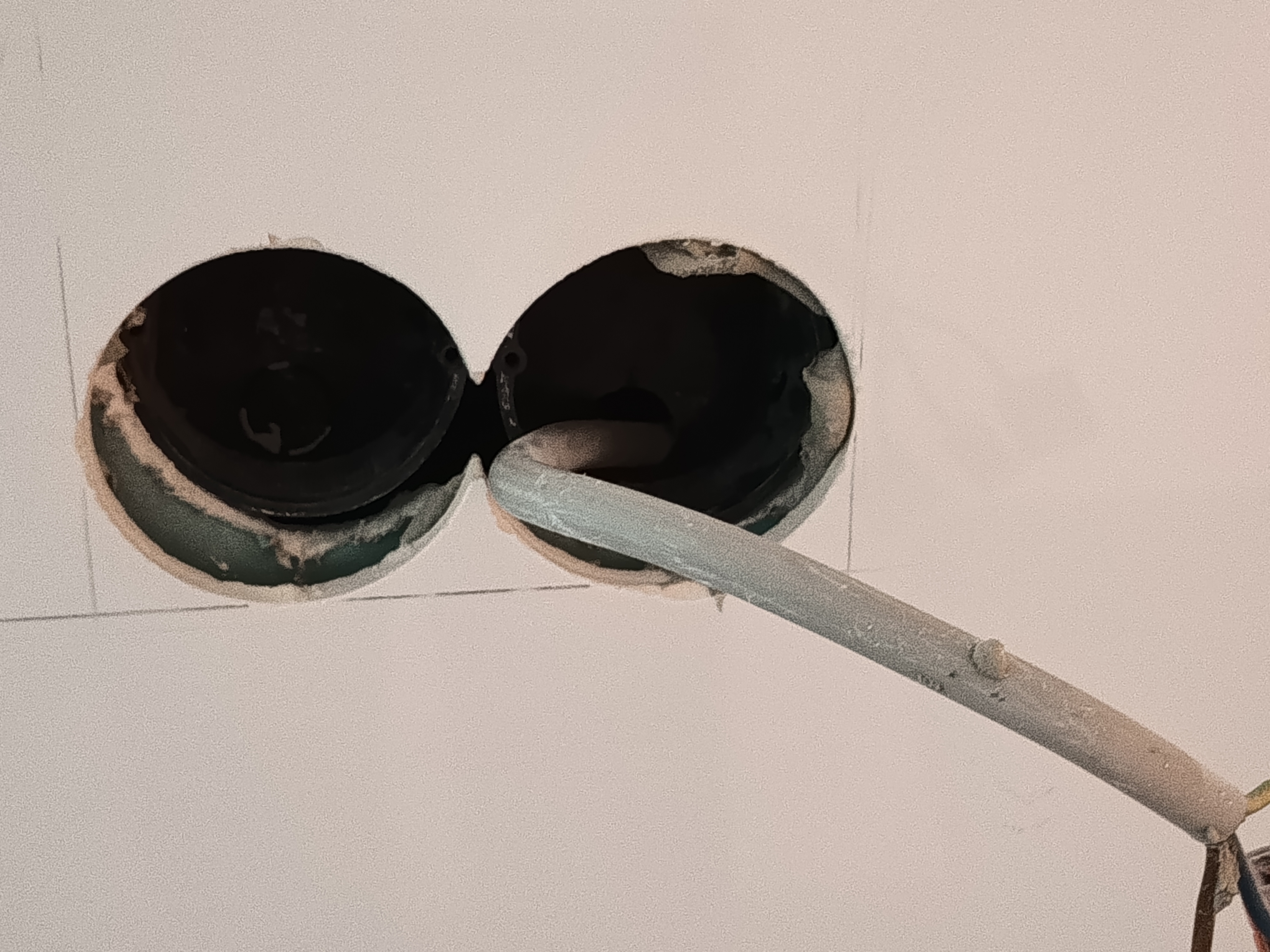 Tätigkeit: Herstellung und Montage einer Steckdose im Hohlraum-Regipsbereich, inkl. Spachtelarbeiten, mehrfache Demontage/Montage und Anpassung wegen der Unterkonstruktion.